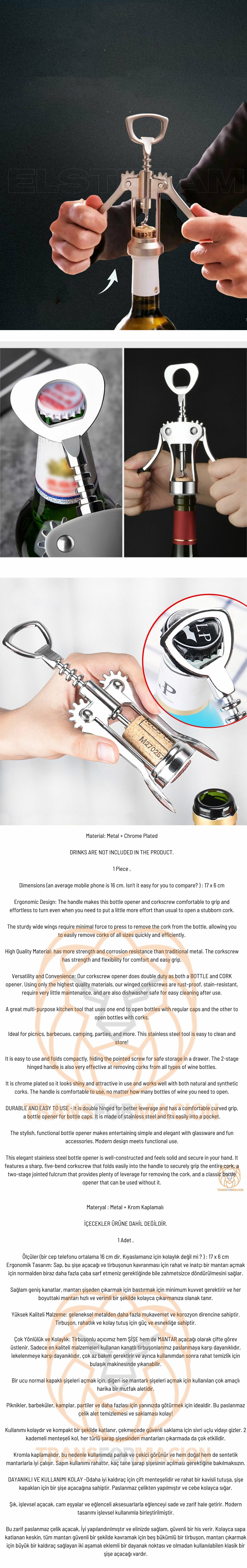 Çok Yönlülük ve Kolaylık: Tirbuşonlu açıcımız hem ŞİŞE hem de MANTAR açacağı olarak çifte görev üstlenir. Sadece en kaliteli malzemeleri kullanan kanatlı tirbuşonlarımız paslanmaya karşı dayanıklıdır, lekelenmeye karşı dayanıklıdır, çok az bakım gerektirir ve ayrıca kullanımdan sonra rahat temizlik için bulaşık makinesinde yıkanabilir.